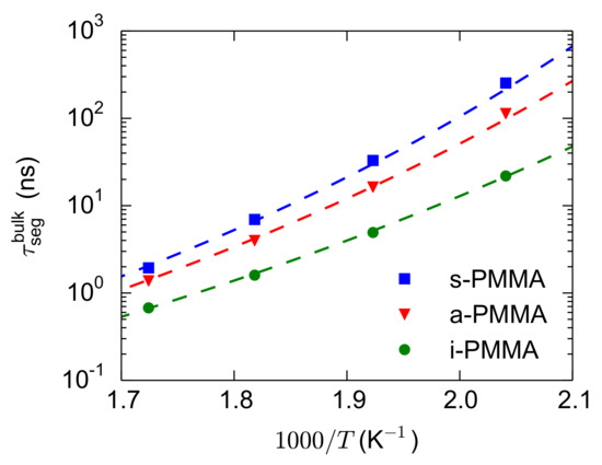 For the calculation of , the bulk melts of i-, a-, and s-PMMA were simulated at 580 K, 550 K, 520 K, and 490 K and the values were calculated. Then, the values of each stereoisomer were fitted with a Vogel–Fulcher–Tammann (VFT) relation (). The parameters of the fitted VFT curves are: sec and K for the three model PMMA stereoisomers and K, 287 K, and 298 K for i-, a-, and s-PMMA, respectively (because of the extensions of the runs and recalculations of the relaxation times, the values are very slightly different from our previous results [44,49]). The bulk segmental relaxation times and the fitted VFT curves are shown in Figure 6. The obtained VFT relations are used for the estimation (through interpolation or extrapolation over short temperature intervals) of the temperature ( in Equation (3)) corresponding to a given relaxation time ( in Equation (3)).