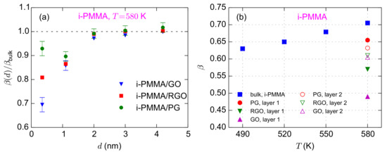 In the last part of this section, we discuss the values of the KWW exponents ( in Equation (2)) for the confined systems. In general, a lower value of corresponds to a broader distribution of relaxation times in the system. The layer resolved values of for i-PMMA/PG, i-PMMA/RGO, and i-PMMA/GO systems at K are provided in Figure 9a. The interfacial layers, particularly the first and second layers, have lower values of relative to the bulk melts; furthermore, increasing the concentration of functional groups leads to the decrease of at the interfacial region. Above, we have described the deceleration of the segmental dynamics at the interfacial region through a temperature shift (). Thus, it is reasonable to compare the of an interfacial layer (at distance d) with the of the bulk melt at a lower temperature, where the interfacial layer and the bulk melt have a similar average segmental relaxation time. Figure 9b shows the values of for the the first and second interfacial layers for i-PMMA confined systems at K, together with the values of for the bulk melts of i-PMMA at different temperatures. From Table 1, one can find the temperature shifts that make the correlation times of the bulk melt similar to the correlation times of the interfacial layers. As shown in Figure 9b, with decreasing temperature, of the bulk system decreases (this is to be expected since as a system approaches Tg its dynamics becomes more heterogeneous); however, in all i-PMMA/PG, i-PMMA/RGO, and i-PMMA/GO cases, segments in both the first and second interfacial layers exhibit lower values than the corresponding bulk segments with the same (average) segmental relaxation time. Therefore, it is clear that the distribution of the segmental relaxation times is broader in the interfacial layers, even when the average relaxation times of the bulk melt and the interfacial layers are similar.