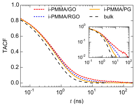 Overall TACF curves (calculated for the entire confined melts) for i-PMMA/PG, i-PMMA/RGO, and i-PMMA/GO systems at K. The inset shows the data in a log-log plot.
