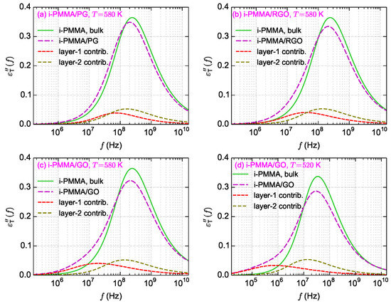 Figure 11a–c shows the calculated curves for i-PMMA/PG, i-PMMA/RGO, and i-PMMA/GO systems at K, whereas Figure 11d presents curves for i-PMMA/GO at K. In each panel of Figure 11, the curves of the bulk melt, the (entire) confined melt, and the contributions of the first and second interfacial layers (0–7 Å and 7–15 Å) in the of the confined melt are presented. In addition, Figure 12a explicitly shows the surface–chemistry dependence of for the confined melts of i-PMMA at K. Some important observations can be made out of these data. Due to the deceleration of the segmental dynamics at the interfacial region, the curves of the confined melts are broader (toward lower frequencies) and have lower amplitudes relative to the corresponding bulk curves. These effects become more pronounced with increasing the concentration of surface functional groups and decreasing temperature. The position of the peak maximum is also worth attention: in all cases, a slight shift of the maximum of the (of the confined melts) to lower frequencies is observed, whereas the shift is more pronounced in the case of PG containing systems. Figure 11c,d show the loss spectra of i-PMMA/GO system at K and K, respectively. With reducing temperature, the separation between the bulk and the interfacial segmental processes increases on the frequency axis (see also the data of Figure 5); hence, at 520 K, as compared to 580 K, a rather distinct shoulder is seen in the curve of the i-PMMA/GO system.