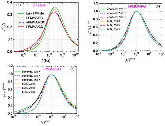 Figure 12b,c shows the temperature dependence of normalized spectra (normalized with the frequency and height of their maxima) for the bulk i-PMMA melts and the confined i-PMMA melts between PG and GO sheets; normalization has been done following the procedure used for checking the applicability of time-temperature superposition principle [51]. Upon normalization, the bulk spectra become almost identical (except slight differences in high frequency region). However, the shape of the normalized confined-melt spectrum is temperature dependent (particularly for i-PMMA/GO, Figure 12c) which shows the shortcoming of the time-temperature superposition for describing the segmental dynamics of the model confined melts [51]. The reason is the stronger temperature dependence of the segmental dynamics at the interfacial layer than the segmental dynamics at (rather bulk-like) middle layer (see also Figure 5).