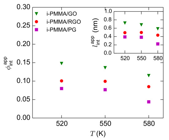 The calculated values of for the s-PMMA confined systems are provided in Figure 8. Comparing different temperatures, the values of s-PMMA systems are more scattered than those of i-PMMA ones. However, the general trend seems similar to the results of i-PMMA systems and, in the studied temperature range, seems to have a weak temperature dependence. For the adsorption layer, approximately equals 27 K, 41 K, and 69 K for s-PMMA/PG, s-PMMA/RGO, and s-PMMA/GO, respectively (based on K data). For all cases, at the adsorption layer, interfacial s-PMMA systems have lower values of relative to the corresponding i-PMMA systems. This trend of the interfacial segmental dynamics correlates with the better interfacial packing of, and the formation of longer trains as well, by i-PMMA chains, as compared to s-PMMA ones (see Figure 2).