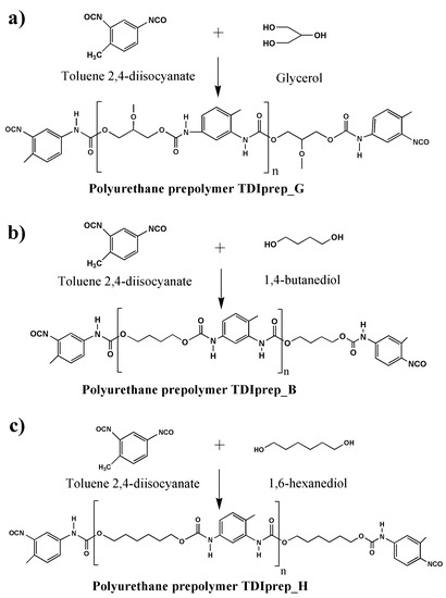 For the preparation of TDI-prepolymers, 20.90 g (120 mmol) of toluene 2,4-diisocyanate (TDI) was dissolved in 40 mL of dried cyclohexanone. The reaction vessel was purged with dried nitrogen to prevent any secondary hydrolysis. The temperature of the mixture was gradually raised to 80 °C with a heating rate of 2 °C/min and was continuously purged with nitrogen. When the temperature reached 80 °C, either 3.68 g (40 mmol) of glycerol, 5.41 g (60 mmol) of 1,4-butanediol, or 7.10 g (60 mmol) of 1,6-hexanediol was added into the synthesis mixture, and after the addition all having identical 100% excess of NCO groups. The reaction was left to stir at 80 °C for 24 hours. After 24 h, the resulting reaction mixture was evacuated at 25 mBar and 95 °C for 8 h in order to remove the unreacted isocyanate and cyclohexanone. The synthesis reaction for each prepolymer is schematically presented in Figure 1.
