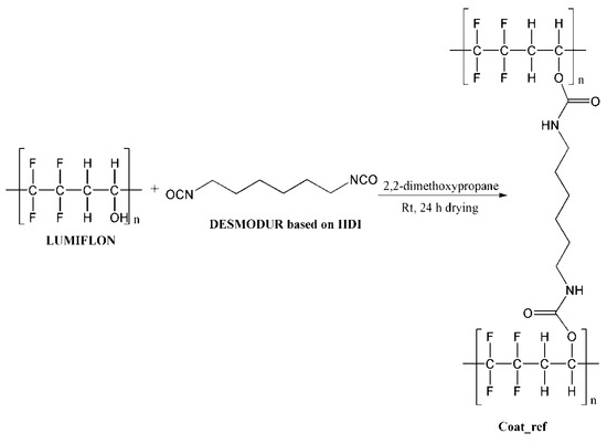 For the preparation of the composite coatings, selected microcapsules (20 wt%) were mixed in the mixture of Lumiflon LF 9716 (8.5 g) and Desmodur N3900 (2.12 g). As a thinner, 3.65 g of 2,2-dimethoxypropane was used. Coatings were applied on standard metal testing plates using a dip-coating procedure with ~30 µm thickness, and left to dry overnight. For the purpose of comparison, coating without the microcapsules was also applied on metal plates under the same conditions, where the thickness of the coating was ~25 µm. The completion of the curing reaction of the coating was confirmed by FT-IR analysis, by monitoring the disappearance of the NCO peak at 2276 cm−1. The chemical reaction which occurred during the coating preparation is shown in Figure 3.