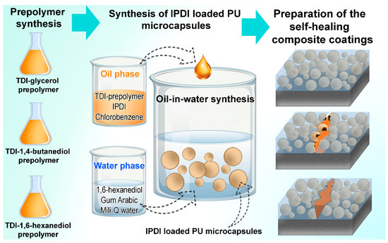 Nevertheless, comprehensive research, including the synthesis of different TDI prepolymers, preparation of PU microcapsules, and their inclusion into the coatings, has not yet been performed. In this study, the influence of the prepolymer type on the chemical and morphological properties of microcapsules, as well as the protective and self-healing properties of the composite coatings, were researched. For this purpose, three different prepolymers were synthesized and studied, namely TDI-glycerol, TDI-1,4-butanediol, and TDI-1,6-hexanediol. The prepolymers were used for the synthesis of PU microcapsules loaded with IPDI, prepared according to oil-in-water synthesis with the use of 1,6-hexanediol as a chain extender. The influence of different concentrations of stabilizer in the water phase on the morphological and chemical properties of the microcapsules was also studied, by using 7, 10, and 17 wt% concentrations of gum arabic (GA). Selected microcapsules with the most promising morphological and chemical properties were incorporated into a mixture of commercially available coatings in the concentration of 20 wt%, and the self-healing and anticorrosion properties of the composite coatings were investigated.