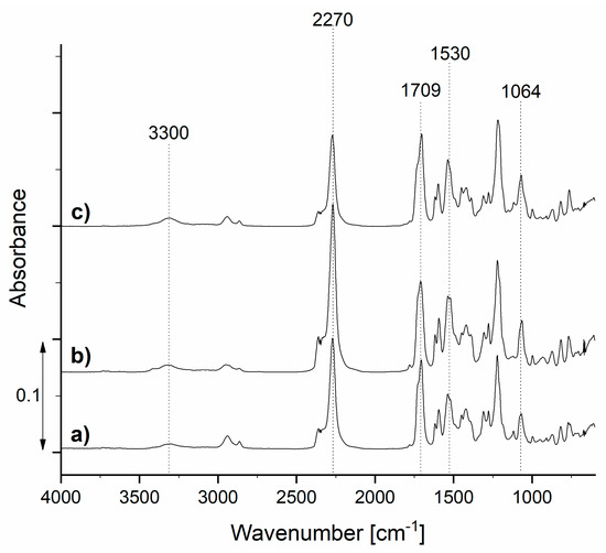 Figure 5. FTIR spectra of the synthesized prepolymers TDIprep_G (a), TDIprep_H (b), and TDIprep_B (c).