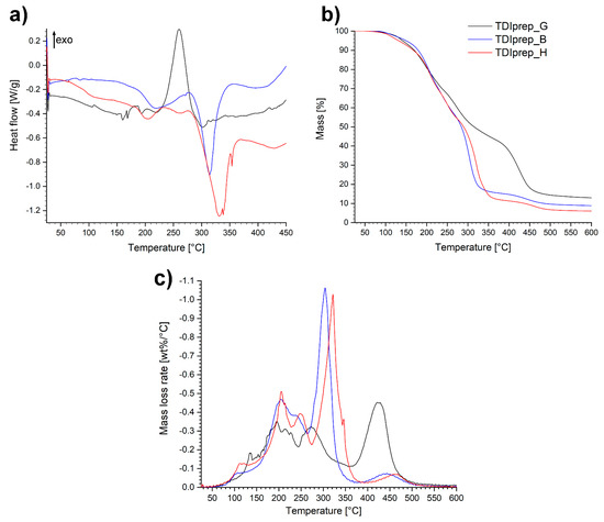 The first postulation was that a certain degree of free OH groups was present in the molecule of the glycerol-based prepolymer, which could react with NCO groups only at an elevated temperature due to steric constraints in the molecule. The formation of additional crosslinks at high temperatures (250 °C) would then postpone the degradation process and hence evaporation of the starting materials would not be as evident as in the case of linear prepolymers (TDIprep_B and TDIprep_H). Nevertheless, this theory was dismissed by IR and CAN (ceric ammonium nitrate) colour test, which showed that free OH groups were not present in the molecule. Additionally, DSC analysis of TDIprep_G, was performed in a nitrogen atmosphere up to 600 °C (Figure S2). Based on the results, there was no endothermic peak present above 300 °C; instead, two additional exothermic peaks were confirmed. This furtherly invalidated our initial postulation.