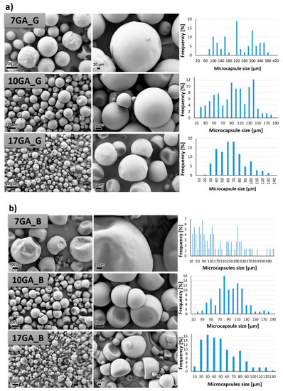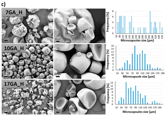 The variation in the concentration of the stabilizer (GA) during the synthesis also significantly influenced the size and the morphology of the synthesized microcapsules. In general, the increase in the concentration of the GA decreased the size of the microcapsules, where the average diameter of the microcapsules 7GA_G, 10GA_G, and 17GA_G was 217.82, 89.79, and 61.14 µm, the microcapsules 7GA_B, 10GA_B, and 17GA_B had a diameter of 174.53, 89.33, and 45.28 µm, and the diameter of the microcapsules 7GA_H, 10GA_H, and 17GA_H measured 220.78, 95.44, and 77.73 µm, respectively. The lowest amount of the stabilizer used in the synthesis procedure also imposed the least uniform size distribution of the microcapsules, while the size distribution of the microcapsules synthesized with higher concentrations of 10 and 17 wt% GA was more uniform. When the lowest (7 wt%) concentration of GA was used in the synthesis, the shell wall of the prepared microcapsules became wrinkled, which was most obvious in the case of 7GA_H microcapsules. Hence, the microcapsules’ wrinkled morphology could be caused by the inconsistency in the reaction kinetics, elastic forces of the shell, and fluid influenced shear forces [16,18].