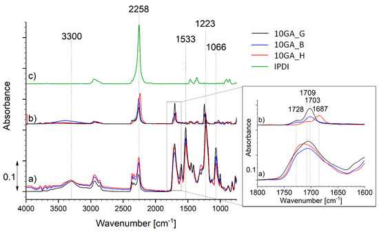 Figure 8. FTIR spectra of the crushed microcapsules 10GA_G, 10GA_B and 10GA_H (spectrum a), filtered core material (spectrum b), and pure IPDI (spectrum c).