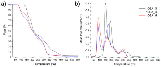 Thermogravimetric properties of the microcapsules 10GA_G, 10GA_B, and 10GA_H, determined using TGA and DTG analysis, are portrayed in Figure 9.