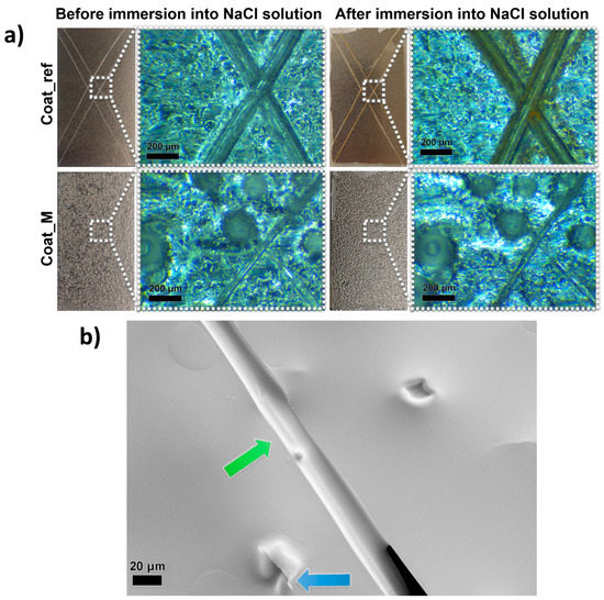 Figure 10. Visual presentation of the scratched samples Coat_ref and Coat_M taken with a camera and optical microscope, before and after the immersion of the samples into the NaCl solution (a) and SEM image of the scratched composite coating, showing the release of the IPDI from the ruptured microcapsule and filling of the scratched area with polyurethane film (b).