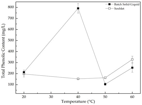 The total phenolic content (TPC) obtained using both extraction methods (batch solid-liquid and Soxhlet), are illustrated in Figure 1.