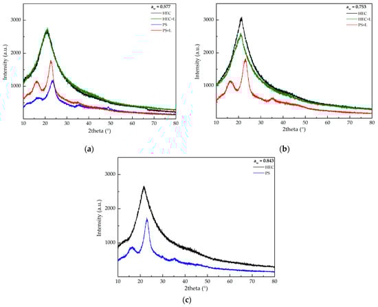 X-ray Diffraction results for HEC and PS films analysis exposed to (a) 0.577; (b) 0.753; (c) 0.843 aw.