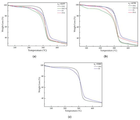 It is possible to identify two degradation steps in the prepared films. The first weight loss, which can be observed in all the analyzed films, occurred at around 100 °C due to the evaporation of the water absorbed by the films. The second weight loss, at around 300 and 205 °C, was caused by the HEC and PS cellulose degradation processes such as depolymerization and dehydration of glycosyl units, respectively [25,30]. In both cases, HEC + L presented the lowest thermal stability when compared with PS films. It was not possible to identify a characteristic weight loss for the phenolic compounds present in the HEC + L and PS + L films. By analyzing Table S2 it was not possible to directly correlate variations in the aw values with the thermal stability of the films.