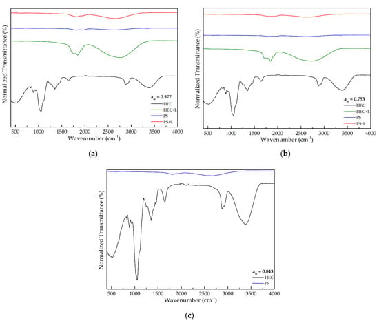 FTIR spectra for HEC and PS films exposed to (a) 0.577; (b) 0.753; (c) 0.843 aw.