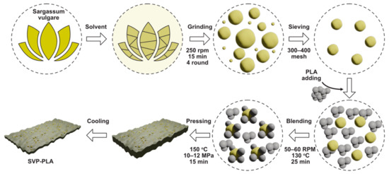 SVPs were washed with acetone and dried in an oven at 90–100 °C for 24 h. Then dried SVPs (20 wt.%) were mixed with PLA (80 wt.%) (Goodfellow, 459-898-81, Coraopolis, PA, USA) in a mechanical mixer operating at 150 °C for 25 min at a rotor speed of 50–60 rpm [29]. After mixing, the composites were poured into a Teflon mold and pressed into thin plates with a custom hot press operating at 150 °C and 10–12 MPa for 15 min. Afterwards, the hot-pressed composite was cooled down to RT in the oven. The whole process is schematically depicted in Figure 1. Composite patches were cut into 1 cm × 1 cm sample dimensions for further characterization.
