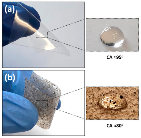 (a) Neat PLA (b) SVP-PLA composite patch and corresponding water contact angle (WCA) results.