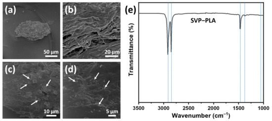 FT-IR spectra were recorded for SVP-PLA composite, as shown in Figure 3e. Five peaks at 2915, 2845, 1467, 1374, and 1060 cm−1 were identified in the FTIR spectra of SVP-PLA composite. Two characteristic peaks at 2915 and 2848 are assigned to a C—H stretching vibration [32]. The asymmetric and symmetric bending absorption of CH3 can be assigned at consecutive peaks at 1467 and 1374 cm−1, respectively [33]. These peaks are all typical and indicative of the identification of PLA. The C—O—C vibrations of cellulose, arising from SVP, might be assigned by broadening peak around 1050 cm−1 [34]. One should keep in mind that since the 80% of the SVP-PLA composite is made of PLA it is difficult to resolve specific peaks corresponding SVP. However, all peaks can be identified with individual materials in the SVP-PLA composite as shown in Figure S2.
