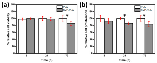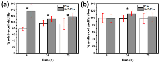 In contrast to SaOS-2 cells, HOBs cultured on SVP-PLA showed significantly higher cell viability during the whole cell culturing period as shown in Figure 5a (p: 0.002, p:0.021 and p:0.006 at 6, 24 and 72 h respectively). At early stages (6 h) where the cell medium was rich with nutrients, we observed a higher significance between the viability of HOBs cultured on neat PLA and SVP-PLA. BrdU assay (Figure 5b) was also in agreement with MTT assay indicating proliferative effect of SVP-PLA on HOBs. However, a significant difference could be observed only at the 24 h examination (p: 0.019). Overall, the cell proliferation decreased by the time as an expected consequence of the decrease of nutrients in the cell medium. However, during the whole examination period, HOBs cultured on SVP-PLA showed higher proliferation.