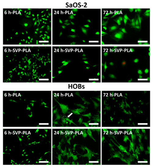 Fluorescence imaging of SaOS-2 cells and HOBs on neat PLA and SVP-PLA composite at 6 h, 24 h, and 72 h culturing time (Scale bars: 200 µm). The results have shown in general lower density of SaSO-2 cells on SVP-PLA patches as compared to the PLA group, which also decreases over time. Besides that, scattered dead bacteria were present on SVP-PLA patches after 72 h. In contrast, a shift to a higher viability of osteoblasts with time could be seen in the SVP-PLA group.