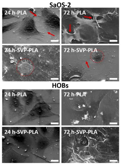 SEM analysis of HOBs revealed that filopodia-like subcellular structures could be detected on both neat PLA and SVP-PLA patches at 24 h. However, cell density was on SVP-PLA patches relatively high. At 72 h, HOBs on SVP-PLA showed higher number of filopodia and concomitant interactions, which ensured a clear cell-to-cell contact. These findings are in accordance with morphologies detected in florescence imaging (Figure 6).