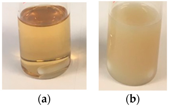 Therefore, the interaction of the phosphate groups of the Sipomer PAM200 and the surface of the organically modified CeO2 nanoparticles (which was not disclosed by ALTANA), made the CeO2 nanoparticles to migrate to the monomer droplet/aqueous phase interface (polymer particle/aqueous phase after polymerization). This surfactant–nanoparticle interaction could be the reason for the decreased stabilization capability of the surfactant, causing the formation of some coagulum in this polymerization. Anyway, good quality clear films were obtained after casting Bioacrylic and CeO2-Bioacrylic latexes in silicone molds, even if the hybrid one had a slight yellowish color due to the presence of CeO2 nanoparticles (Figure 3).