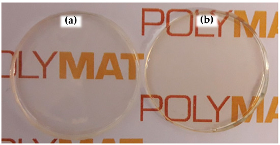 Free films formed at 24 ± 2 °C and 50 ± 5% relative humidity from (a) Bioacrylic latex and (b) hybrid CeO2-Bioacrylic latex.