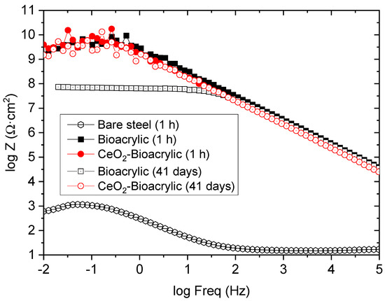 In order to study the effect of the CeO2 nanoparticles, intact films (both neat and hybrid) with similar thickness (30–40 µm) were evaluated by EIS. Figure 5 shows the impedance diagrams after different exposure time (1 h and after 41 days, respectively). A capacitive behavior can be observed for both films at the beginning of the exposure (1 h), as an indication of the good barrier capabilities. Indeed, a single time constant is observed for both films, having an impedance modulus (|Z|) at low frequency (0.01 Hz) in the range 109–1010 Ωcm2 (|Z|0.01Hz). It indicates an excellent barrier protection compared to acrylic waterborne coating without [49] and with a topcoat [50] or to epoxy coatings formulated with nano-CeO2 during exposure to NaCl electrolytes [41,51], where coatings were showing a much lower impedance value at shorter exposure time. However, this excellent barrier protection was only maintained after 41 days of exposure for the hybrid film. In fact, after that time, the Bioacrylic film decreased its impedance |Z|0.01Hz in more than one order of magnitude, reaching a value around 108 Ωcm2. The better performance of the hybrid coating can be justified by the physical blocking effect to the electrolyte diffusion thanks to the CeO2 nanoparticles [31,52], taking into account their stability in neutral to basic aqueous environemnts [53]. Therefore, the long-term durability shown by the hybrid film can be attributed to the inhibition effect of CeO2 nanoparticles located in the surface of the polymer particles.