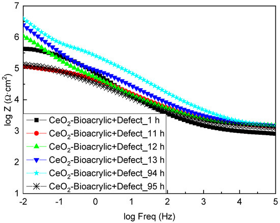 Apparently, the completely different behavior shown by both films, in terms of OCP, might be attributed to the role of CeO2 as a corrosion inhibitor. Therefore, a tailored analysis of the EIS diagrams was done for the different times of interest (i.e., before and after the variation of the potential values in Figure 6). Figure 7 shows the EIS diagrams for the CeO2-Bioacrylic film with an artificial defect after 1, 11, 12, 13, 94 and 95 h of exposure, respectively. If the impedance modulus is compared at low frequency (|Z|0.01Hz) for each time, it can be observed that |Z|0.01Hz was 6 × 105 Ωcm2 after 1 h of exposure. It was decreasing slightly to around 105 Ωcm2 after 11 h, indicating that the corrosion process was taking place up to then. However, this trend was drastically changed when a sudden increase of |Z|0.01Hz occurred at 12 h—impedance reaching 106 Ωcm2 and 6 × 106 Ωcm2 at 12 and 13 h, respectively. A steady state value was maintained above 5 × 106 Ωcm2 from 13 h until 94 h of exposure, thanks to the corrosion inhibition capabilities of CeO2 nanoparticles. This is in agreement with the delay of the corrosion onset shown on coatings formulated with CeO2 nanoparticles having an artificial defect: the corrosion activity is limited to the vicinity of the defective area according to the results obtained by localized electrochemical techniques [56]. Finally, the impedance dropped down again to the minimum value (105 Ωcm2), indicating that most probably the corrosion inhibition was exhausted and the metal/film interface on the artificial defect was not protected anymore.