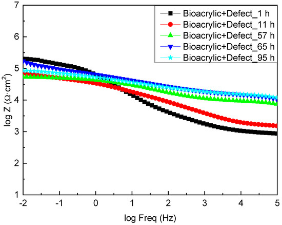 On the other hand, Figure 8 shows the EIS diagrams for the Bioacrylic film with an artificial defect after 1, 11, 57, 65 and 95 h of exposure to salty water, respectively. Initially, a similar value of the impedance modulus was obtained (3 × 105 Ωcm2) at low frequency (|Z|0.01Hz) compared to the hybrid film (6 × 105 Ωcm2), which also decreased to values below 105 Ωcm2 after 11 h of exposure. In contrast to the CeO2-Bioacrylic film, the impedance value slightly varied until a minimum was reached at 57 h (7 × 104 Ωcm2) due to the absence of any corrosion inhibition into the film. The slight |Z|0.01Hz increase (3 × 105 Ωcm2) observed after 65 h may be related to the presence of corrosion products that are blocking the pinhole/damage that was created with the artificial defect. It can be observed that |Z|0.01Hz remains in a very narrow range (7 × 104/3 × 105 Ωcm2) during the entire test, and it confirms that no protection can be achieved in the absence of CeO2 nanoparticles in the film formulation. Indeed, a |Z|0.01Hz value of 9 × 104 Ωcm2 was obtained after 95 h of exposure, indicating the absence of protection in the interface. Therefore, these results confirm that homogeneously distributed CeO2 nanoparticles are required into the film to provide an efficient corrosion protection of the metal/film interface.