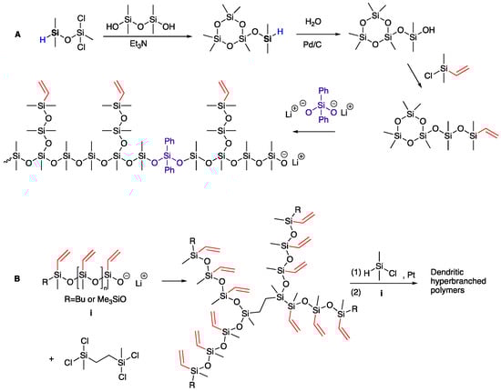 (A) The synthesis of hyperbranched polysiloxane using anionic ring-opening polymerizations [19]; (B) The synthesis of dendrite-branched polysiloxanes [21].