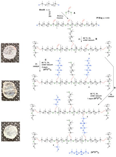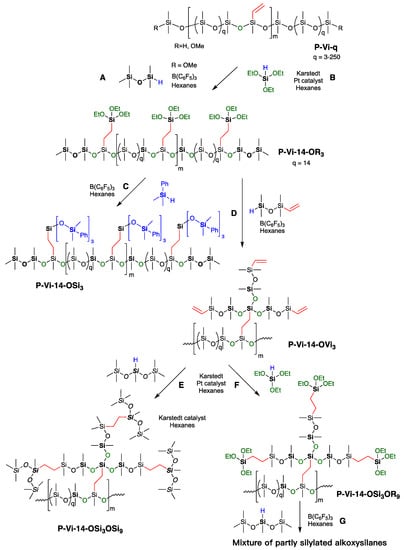 Spatial control of vinyl groups on a silicone backbone was provided by the PR reaction between the difunctional vinyl monomer vinyldimethoxymethylsilane and αω-hydride-terminated PDMS of various chain lengths ranging from the disiloxane to longer chain linear polymers (MW 134 to 21,200 g mol−1 H-Dn-H D = Me2SiO, H = MH = Me2HSiO2/2; thus, H-13-H = MHD13MH) in the presence of the catalytic amount of B(C6F5)3 (0.02–0.20 mol% (Figure 3A) [28]. Using 1H NMR, the depletion of hydrosilane (SiH, ~4.7 ppm) or methoxy (SiOCH3, ~3.5 ppm) signals allowed one to demonstrate full consumption of reagents had occurred to give P-Vi-q, where q = spacing between adjacent vinyl groups. Thus, P-Vi-3 = ((ViMeSiO)(Me2SiO)2)m).
