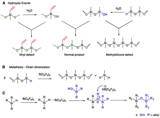 The ideal spacing of vinyl groups was not always observed in these reactions. We attribute this observation to defects introduced by hydrolysis/condensation and metathesis; hydrolysis [29] and metathesis [28,37] reactions are promoted by B(C6F5)3. In both cases, the first formed SiOH groups can undergo condensation to give chain extension. SiH groups in the presence of B(C6F5)3 can also undergo metathesis reactions leading to longer polymers and coproduction of Me2SiH2. Either of these processes will lead to a defect in the chain with either a double or missing vinyl group (Figure 4A,B). Both of the processes leading to defects are less efficient/less rapid than the PR reaction. Thus, an advantage of the use of 1/1 [SiOMe]/[SiH] stoichiometry is a lower likelihood of defects. Note that we currently do not have the analytical capacity to detect these defects.