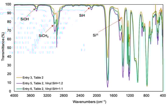 IR spectra for PMS-H03 modified elastomers using P-Vi-28 self-crosslinked elastomers (Table 2). The orange curve shows the IR spectra of precursor elastomer (Entry 3, Table 2), the purple curve shows the IR spectra of PMS-H03 (Vinyl:SiH = 1:2) modified elastomer (Entry 5, Table 2) and the green curve shows the IR spectra of PMS-H03 (Vinyl:SiH = 1:1) modified elastomer (Entry 6, Table 2).