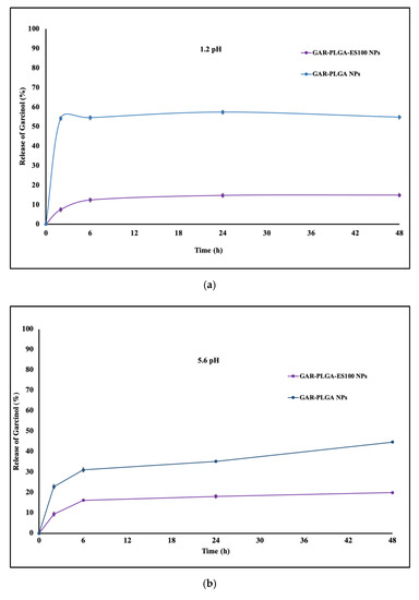 The in vitro release of GAR by GAR-PLGA-ES100 NPs and GAR-PLGA NPs in PBS with 10% FBS (pH 1.2, 5.6, and 7.4) are shown in Figure 3a–c. The drug release from the respective NPs was studied after of 2, 6, 24, and 48 h. The initial burst release of GAR from GAR-PLGA NPs was seen to be 54.12 0.33% in pH 1.2, which continued up to 48 h, retaining the same percentage drug release. However, GAR-PLGA-ES100 NPs showed that only 7.39 0.63% of the drug was released in the initial 2 h at pH 1.2. Later, as it progressed to 24 and 48 h, the drug release was only double the initial burst with 9.98 0.12% and 20.12 0.37%, respectively. At pH 5.6, GAR-PLGA NPs showed an initial release of 22.8 1.16%, whereas GAR-PLGA-ES100 NPs had only a 9.44 0.186% release of the drug. As time proceeded, at 48 h of the study, around 44.78 0.33% of the drug was released by GAR-PLGA NPs and only 20% of the drug was released in GAR-PLGA-ES100 NPs. At pH 7.4, which resembles the neutral pH of the colon, the GAR-PLGA NPs only released 27.1 0.06% of the drug within 2 h. The GAR-PLGA-ES100 NPs demonstrated a 45.69 0.9% release, followed by a 70.2 0.433% release at 48 h. Among all the tested pH, we found GAR from GAR-PLGA-ES100 NPs were released the most at pH 7.4 compared with pH 1.2 and pH 5.6.