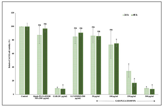 In vitro cytotoxicity assay on CACO-2 cells for 24–48 h. blank-PLGA-ES100 NPs concentration was 500 μg/mL, free GAR was 50 μg/mL and GAR-PLGA-ES100 NPs (50, 100, 250, and 500 μg/mL). Student’s unpaired t-test was carried out to check the statistical significance of the experiment (ns: not significant; * p < 0.05).