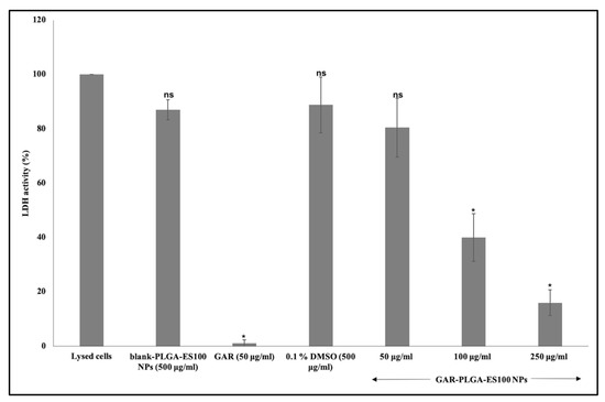 Lactate dehydrogenase (LDH) assay on CACO-2 cells treated for 24 h with blank-PLGA-ES100 NPs. Concentration was 500 μg/mL, free GAR was 50 μg/mL and GAR-PLGA-ES100 NPs (50, 100, and 250 μg/mL). Student’s unpaired t-test was carried out to check the statistical significance of the experiment (ns: not significant; * p < 0.05).
