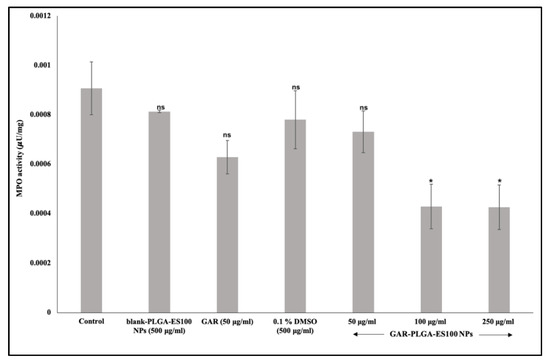 Myeloperoxidase (MPO) assay on CACO-2 cells treated for 24 h with blank-PLGA-ES100 NPs. Concentration was 500 μg/mL, free GAR was 50 μg/mL and GAR-PLGA-ES100 NPs (50, 100, and 250 μg/mL). Student’s unpaired t-test was carried out to check the statistical significance of the experiment (ns: not significant; * p < 0.05).