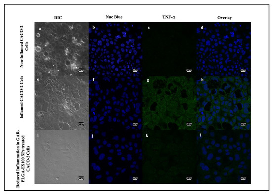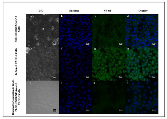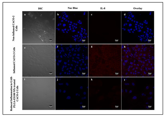 We have examined the expression of NF-B, TNF-, and IL-8 stimulated by PIC in CACO-2 cells using immunofluorescence assay. As seen in Figure 8a–d, NF-B expression was seen without any addition of pro-inflammatory cytokines in the non-inflamed cells [29]. When there is deregulated inflammation manually induced via treatment with PIC (Figure 8e–h), it can cause excessive and long-lasting damage, leading to the development of IBD [30]. The inflamed CACO-2 cells, when treated with GAR-PLGA-ES100 NPs (250 μg/mL), were able to reduce the expression of NF-B within 48 h of treatment (Figure 8i–l).