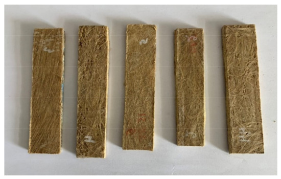 Caryota and Sisal fibers are measured for proportionate weight ratios as discussed above. The fibers were laid uniformly inside the mold before applying any resin to it. After arranging the fibers uniformly, they are compressed for a few minutes in the mold. The compressed fibers were laid over the coat of epoxy resin, ensuring uniform distribution of fibers. The epoxy resin mixture has been poured over the fibers uniformly and compressed for a curing time of 24 h, with a constant load of 5 kg. All samples are fabricated according to ASTM D 638M standards. The fabricated samples of Sisal/Caryota fiber hybrid composites are shown in Figure 2.