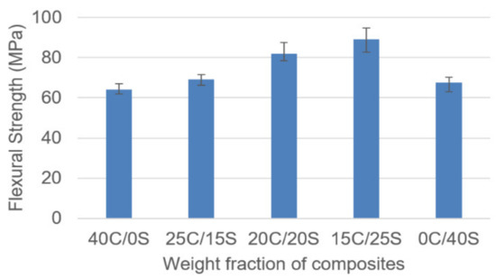 Figure 7 shows the relation between flexural strength and weight fraction of the fabricated composites. As it can be seen from the below figure that the hybrid composites showed superior flexural properties than single fiber composites. 15C/25S hybrid composites showed the highest flexural strength as 89.16 MPa and single fiber Caryota composites showed the least strength as 64.09 MPa. Hybrid composites exhibited good flexural properties which indicate that the materials have brittle properties. It was observed that the flexural properties trend is similar to the tensile properties. The loss in strength of single fiber composites can be explained as (1) early failure of the composite upon external loading. (2) weak interfacial bonds between fiber and matrix material leads to the clustering of fibers.