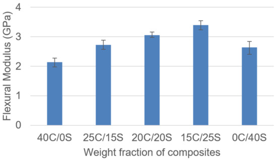 The results presented in Figure 8 show the evolution of flexural modulus according to the fiber weight fractions. It was observed from the results that single fiber Caryota and sisal fiber composites showed a lower flexural modulus than Caryota sisal hybrid composites. Single fiber composites showed 2.14 GPa and 2.64 GPa respectively.