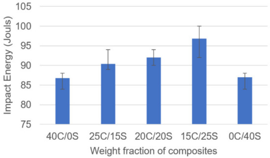 The data presented in Figure 9 was obtained from the impact tests. The specifications of the samples were taken from ASTM standards and the tests were conducted at 21 °C temperature and relative humidity as 28%. It is well known that the impact strength of the composites mainly depends on the properties of reinforcement and matrix material presented in it. It was observed that the hybrid composites showed superior impact strength over single fiber composites. Single sisal fiber composites exhibited the least impact strength as 83.5 Joules.