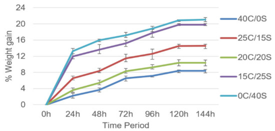 Figure 11 shows the % weight gain by the composites with varying weight fractions to time. It was observed that all the composites samples responded to the moisture (water) when it is exposed. The amount of weight gain by the composites increased with time up to 120 h and remains constant. All hybrid composites showed intermediate results whereas single fiber composites showed the least and highest percentage of weight gain. The reason can be attributed to the presence of void content (porosity) in the composites and the chemical composition (cellulose content) of the fibers. Because the oxygen () in the cellulose reacts to the hydrogen in the moisture and forms the hydrogen-oxygen bonds with it. Sisal fibers contain more cellulose percentage than Caryota, hence it observed more % of water. The porosity in the composites specimens was observed by using SEM analysis and the results were mentioned in Figure 17. It was observed that the hybrid composites have an intermediate percentage of void places compared to the single fiber composites. The presence of void places attracts the water molecules hence the percentage gain is more.