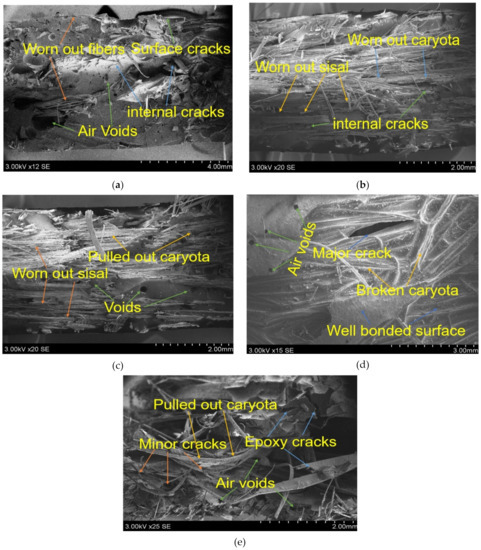 Figure 15 shows the fracture surface of the flexural test composites as a function of hybridization. A brittle fracture of reinforcement and matrix material was observed from the results. The reason can be attributed to the strong interfacial bonds between fibers and epoxy resin. It can be seen from the above figures that the presence of voids and cracks leads to weakening the strength of the composites. It was observed that single fiber composites (Figure 15a,e)) have more cracks and air gaps in them when compared to the hybrid composites, this is due to lack of fiber/resin adhesion and poor bonding nature.