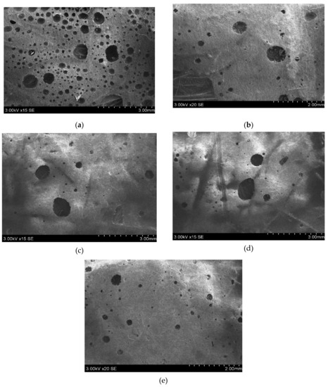 SEM images for porosity (void content) presented in the fabricated composites (a) 0C/40S, (b) 15C/25S, (c) 20C/20S, (d) 25C/15S, (e) 40C/0S.