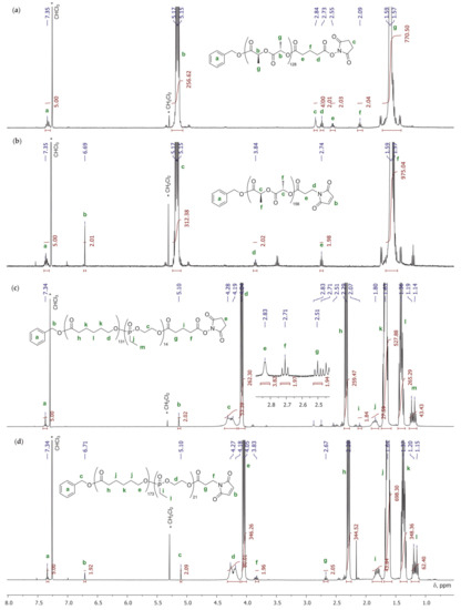 1H NMR spectra of NHS- and MI-functionalized polymers (Table 1, Entries 7 (a), 8 (b), 11 (c), and 12 (d)). The signals of the protons of the fragments of functionalized polymers are marked as letters (bold and green) the solvent impurities are marked by asterisks (*). 3.2. Functionalization by the Reaction of the Polymers with Acyl Chloride 1.