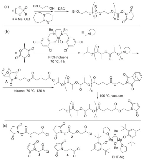 (a) NHS functionalization of “living” polyphosphates and polyphosphonates [37,44]; (b) MI functionalization of “living” poly(l-LA) [42,46]; (c) NHS and MI substituted acyl chlorides and BHT-Mg catalyst used in the synthesis of NHS- and MI-terminated polymers [this work].