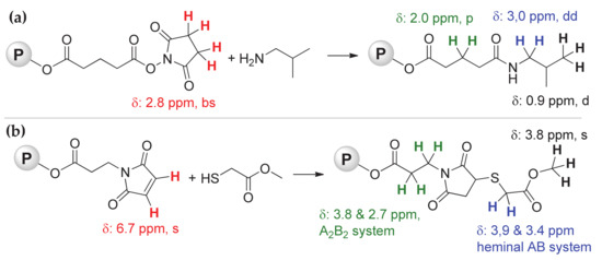 Reactions of NHS- and MI-functionalized polymers with model amine and thiol, 1H NMR criteria of the completion of the processes for NHS- and MI-terminated polymers, (a) and (b), respectively.