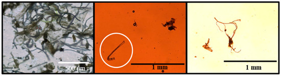 Micrograph of microplastics (MPs) during preparation (left) with different shapes and sizes and those identified in the measured sample (middle). In the white circle, a hook-shaped MP is highlighted, and the other black spots are air bubbles and unidentified organic materials (also in the right image).